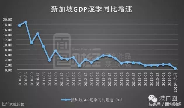 然而,随着后经济危机时代的到来,全球经济和贸易陷入了持续的低迷状态,以贸易起家的新加坡遭受持续打击。过去六年新加坡的经济增速急速下滑,并最终在今年三季度陷入负增长。下图为面包财经根据新加坡统计局绘制的新加坡GDP逐季同比增速图: