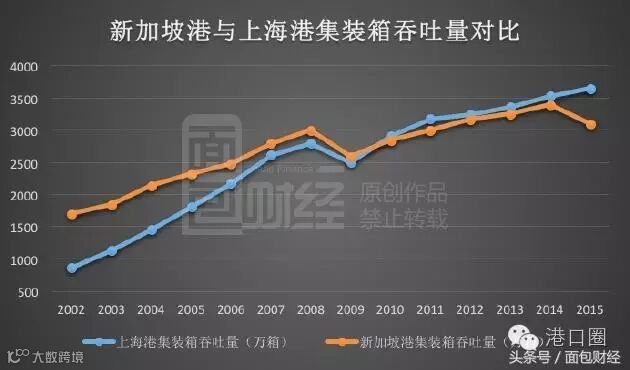 在全球最大港口的排行上,新加坡与上海激烈竞争。2010年新加坡的集装箱吞吐量被上海超越,退居世界第二,但在2015年之前两者悬殊并不大。下图为面包财经根据上海统计局与The Maritime and Port Auto数据绘制的新加坡港与上海港集装箱吞吐量对比图: