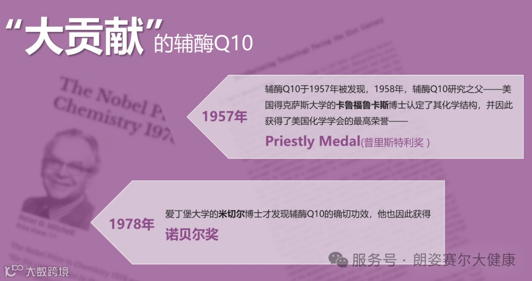 1978年英国爱丁堡大学生物化学家彼得.米切尔 教授因在研究辅酶Q10与细胞能量转换方面的杰出贡献,发现辅酶Q10存在于任何细胞的线粒体中,在人体细胞能量的制造与输送中扮演相当重要的角色,获得当年的诺贝尔化学奖 。