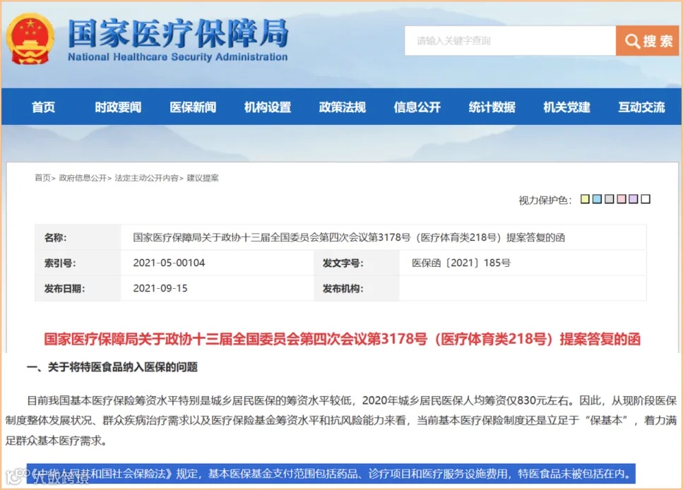 关于特医食品纳入医保的问题,2021年8月31日,国家医保局在政协委员提案答复的函中明确指出:当前基本医疗保险制度还是立足于“保基本”,着力满足群众基本医疗需求。《中华人民共和国社会保险法》规定,基本医保基金支付范围包括药品、诊疗项目和医疗服务设施费用,特医食品未被包括在内。