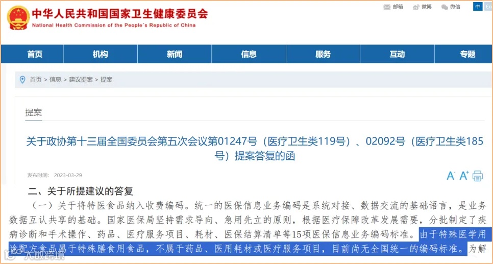 2023年3月29日,针对将特医食品纳入收费编码的问题,国家卫健委答复:由于特殊医学用途配方食品属于特殊膳食用食品,不属于药品、医用耗材或医疗服务项目,目前尚无全国统一的编码标准。