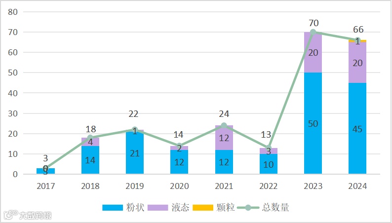 回顾 2017 年至 2023 年期间获批的产品,剂型相对单一,仅包括粉状和液态这两种类型,其中粉状产品在数量上始终占据主导地位。直到 2024 年,颗粒状这一剂型才首次出现在获批产品中,丰富了特医食品的剂型种类。