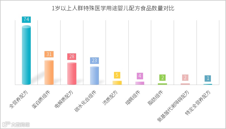 在1岁以上特医食品领域,所有细分类别也均有产品获批,但各类别间产品分布极不均衡,主要集中于全营养配方食品、蛋白质组件、电解质配方、碳水化合物组件等几个类型 ,而特定全营养和氨基酸代谢障碍配方食品种类严重不足。这既体现了市场的需求导向,也反映了我国特医食品开发所面临的困境与难题。