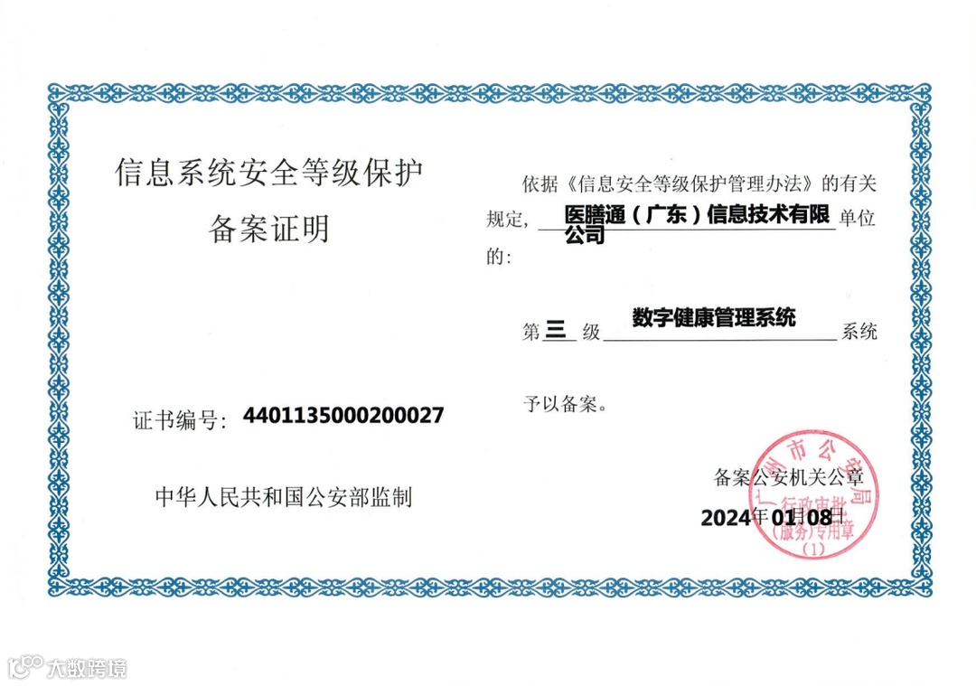 此次医膳通能够顺利获得此项权威认证,意味着我们的数字健康管理系统在信息安全管理、用户隐私保护以及服务稳定性等方面已达到国家高级别标准。
