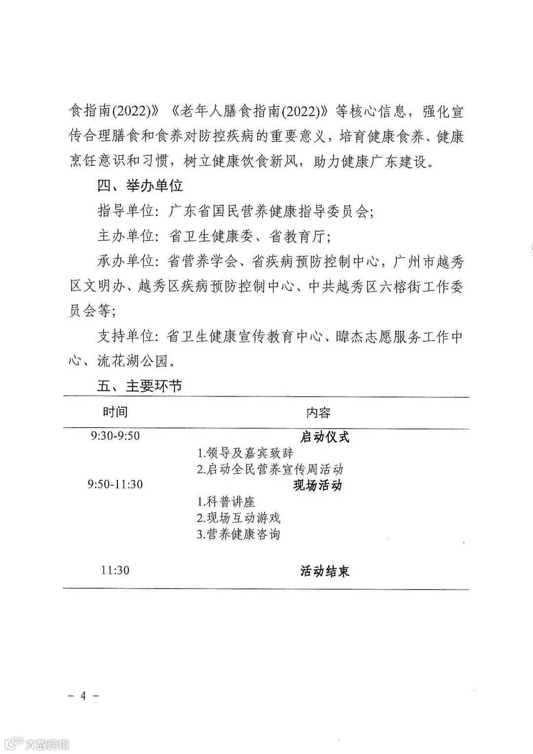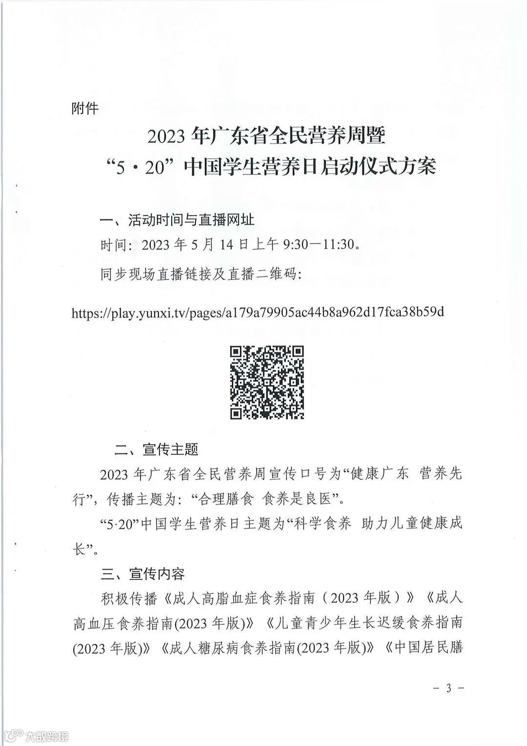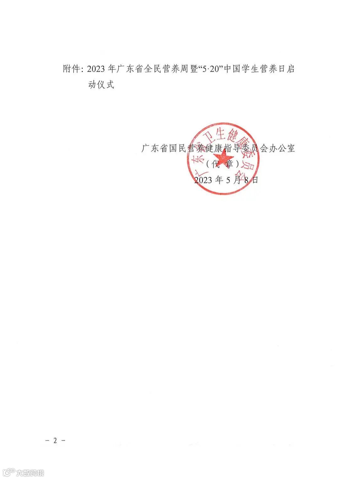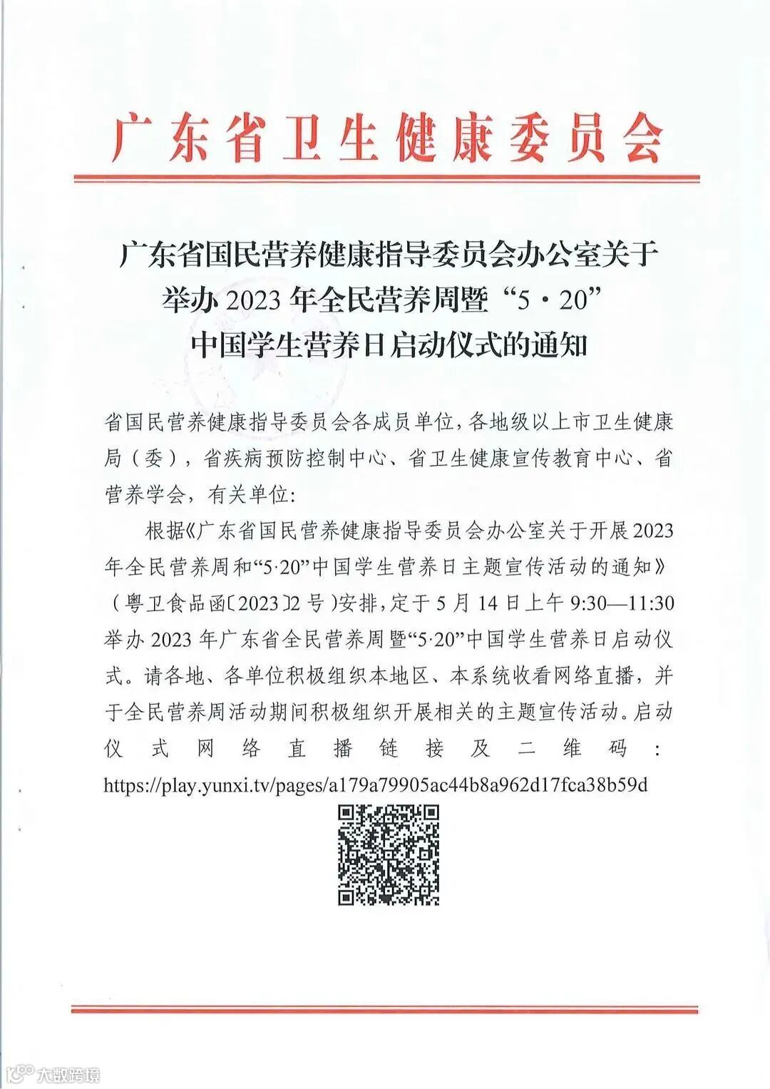 2023年5月8日,广东省卫生健康委员会发布“广东省国民营养健康指导委员会办公室关于举办2023年全民营养周暨“5·20”中国学生营养日启动仪式的通知”。