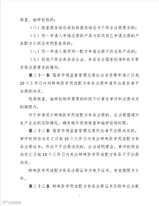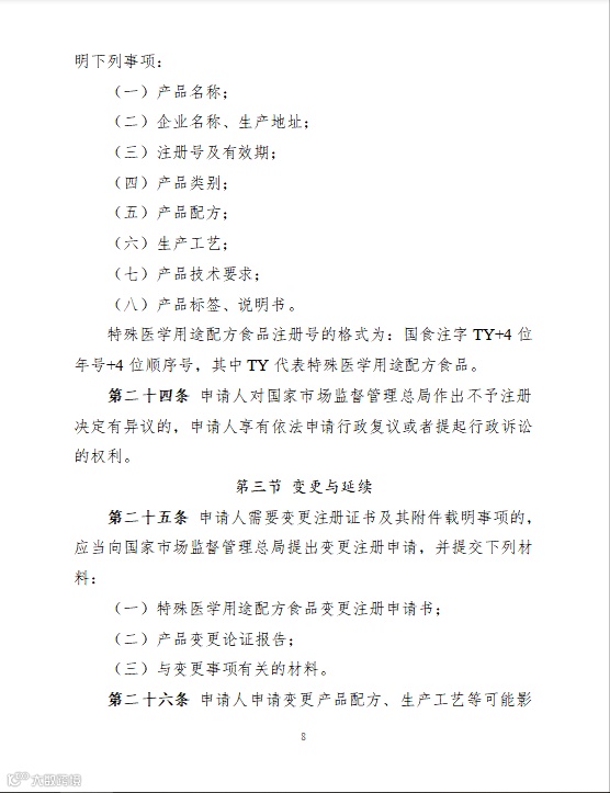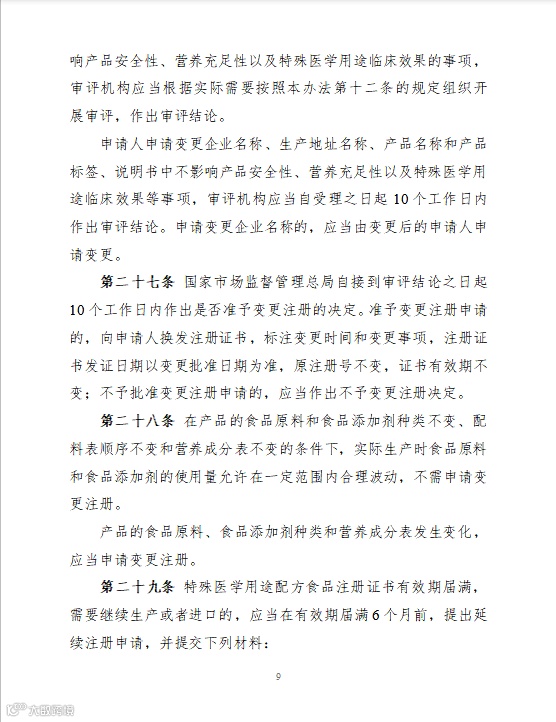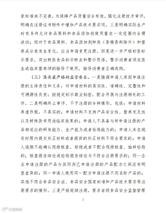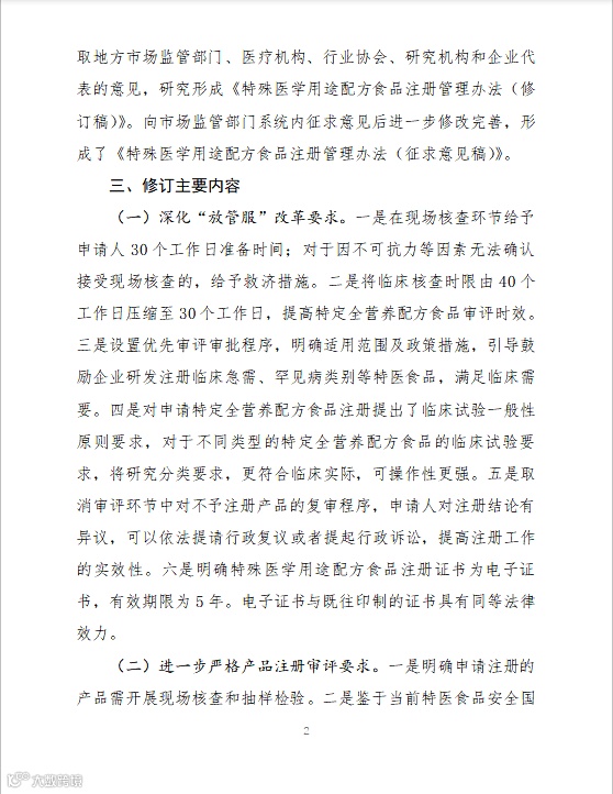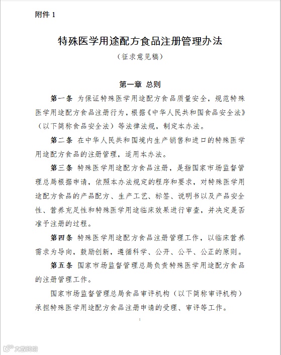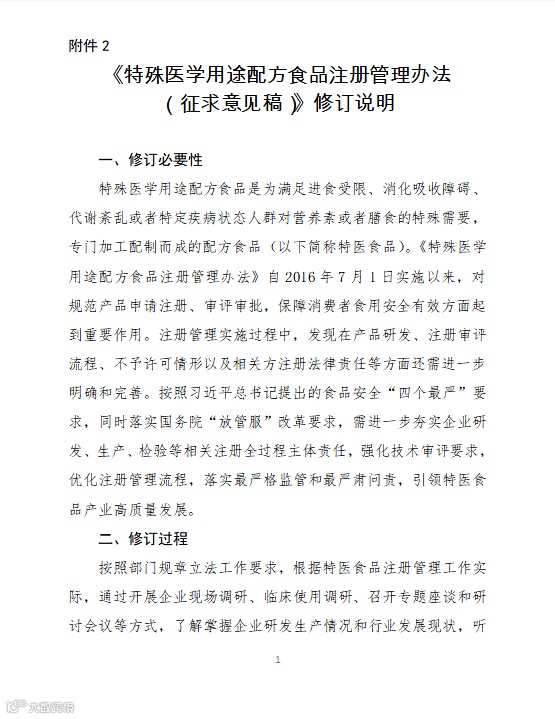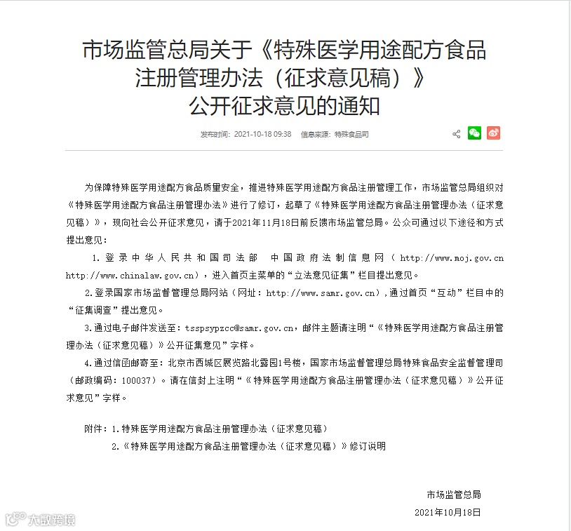 最新通知,2021年10月18日,为保障特殊医学用途配方食品质量安全,推进特殊医学用途配方食品注册管理工作,市场监管总局组织对《特殊医学用途配方食品注册管理办法》进行了修订,起草了《特殊医学用途配方食品注册管理办法(征求意见稿)》。