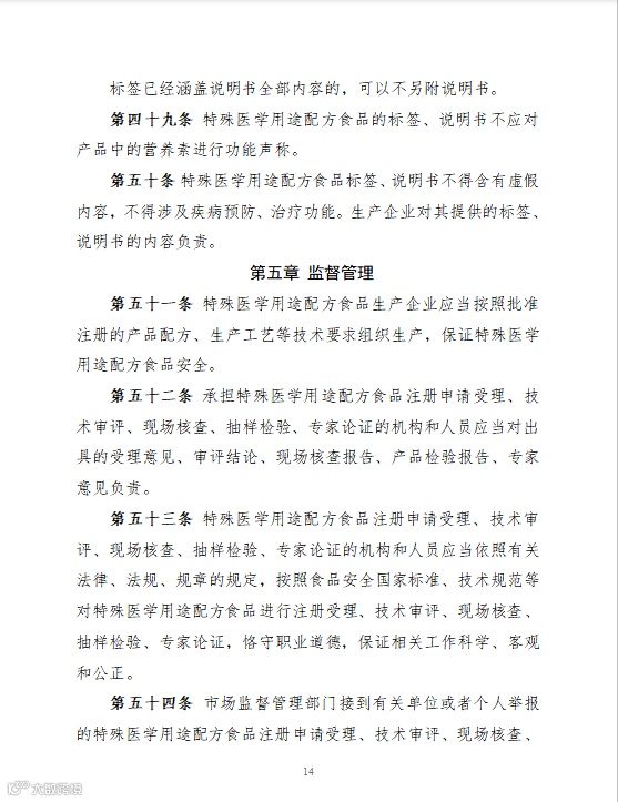 第五章:监督管理:关于特殊医学用途配方食品生产企业的生产要求,保证特殊医学用途配方食品生产安全;