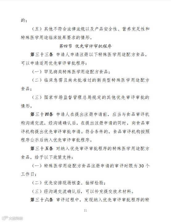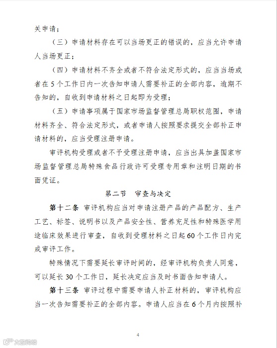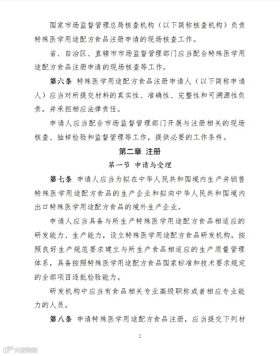 第二章节:注册:该章节又分为四节内容,从申请与受理、审查与决定、变更与延续、优先审评审批程序四个方面的内容说明了特殊医学用途配方食品注册的所需材料及注意事项;