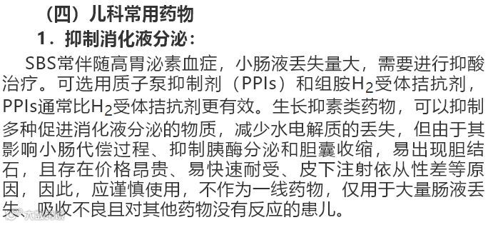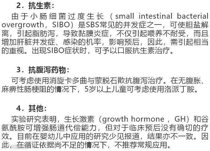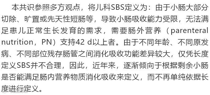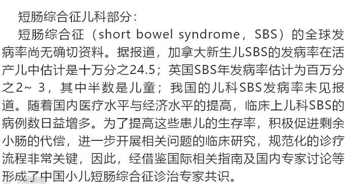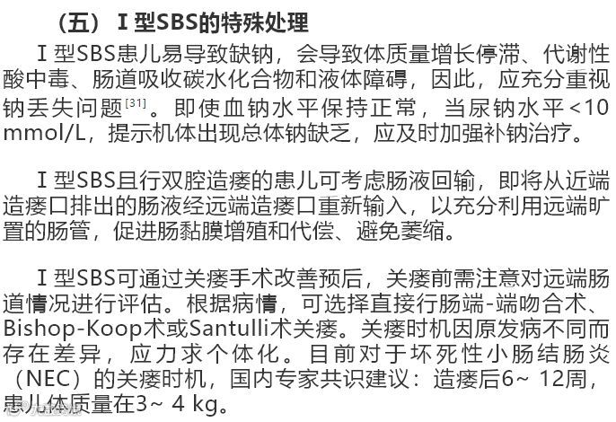 儿科SBS分为Ⅲ型(考虑到小儿本身小肠不长,细分亚型意义不大):Ⅰ型为小肠造口型;Ⅱ型为小肠结肠吻合型(无回盲瓣);Ⅲ型为小肠小肠吻合型(保留回盲瓣)。示意图参见此前发布的短肠综合征专家共识。