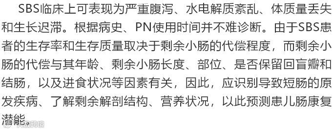 由于导致儿科SBS的原因不同,剩余肠管的功能与预后亦存在差别,如腹裂与肠闭锁患儿剩余肠管的功能与代偿能力往往受损,因此,应注意识别原发疾病。临床上导致婴幼儿SBS常见的原发病如下:肠闭锁、坏死性小肠结肠炎、肠扭转。其它还包括:腹裂、先天性短肠、全消化道型无神经节细胞症等。儿童主要是肠扭转等。