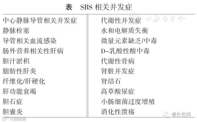 SBS治疗与随访过程中,需密切监测相关并发症(见下表),最重要的2个并发症为导管相关并发症和肠外营养相关性肝病。若出现相应症状或依赖PN时间超过3个月,应尽早转诊到有经验的相关治疗中心。