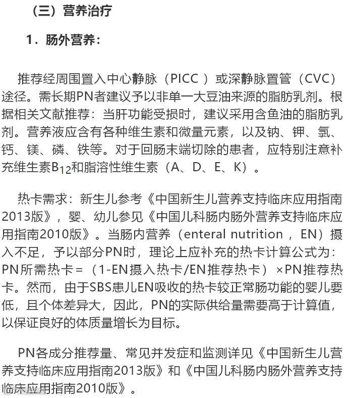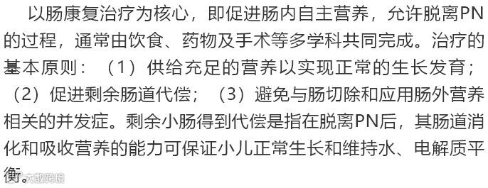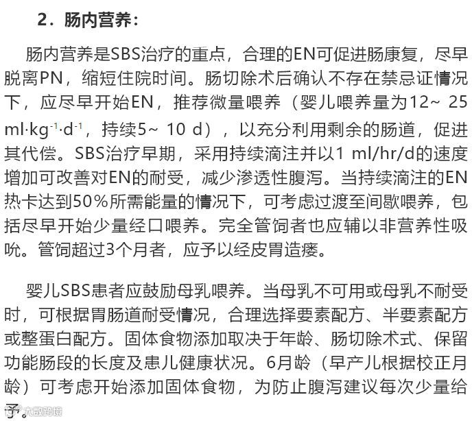 稳定期。剩余肠管的代偿能力已接近极限,以撤离PN为起始点,由EN提供全部热卡所需,逐渐增加经口摄入量与种类。现有报道中,小儿SBS最终能获得肠道代偿,保留回盲瓣者中,剩余小肠长度最短仅10 cm;无回盲瓣者中,最短为15~ 38 cm。加强定期随访,监测营养指标,主要是为减少SBS远期并发症的发病率。