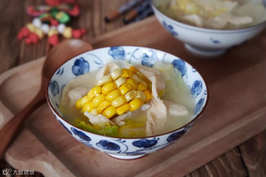 5、然后加入适量水,放入玉米、娃娃菜先炖煮片刻