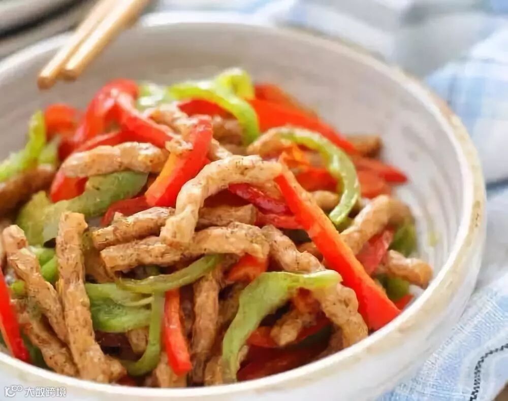 素肉丝约20克、红尖椒1根、绿尖椒1根,姜末、酱油、盐、黑胡椒粉、蔬果粉、水淀粉适量
