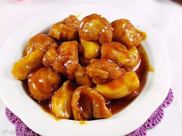 8、烧至汤汁浓缩粘稠,倒入炸好的素肉和荸荠,快速翻炒均匀即可