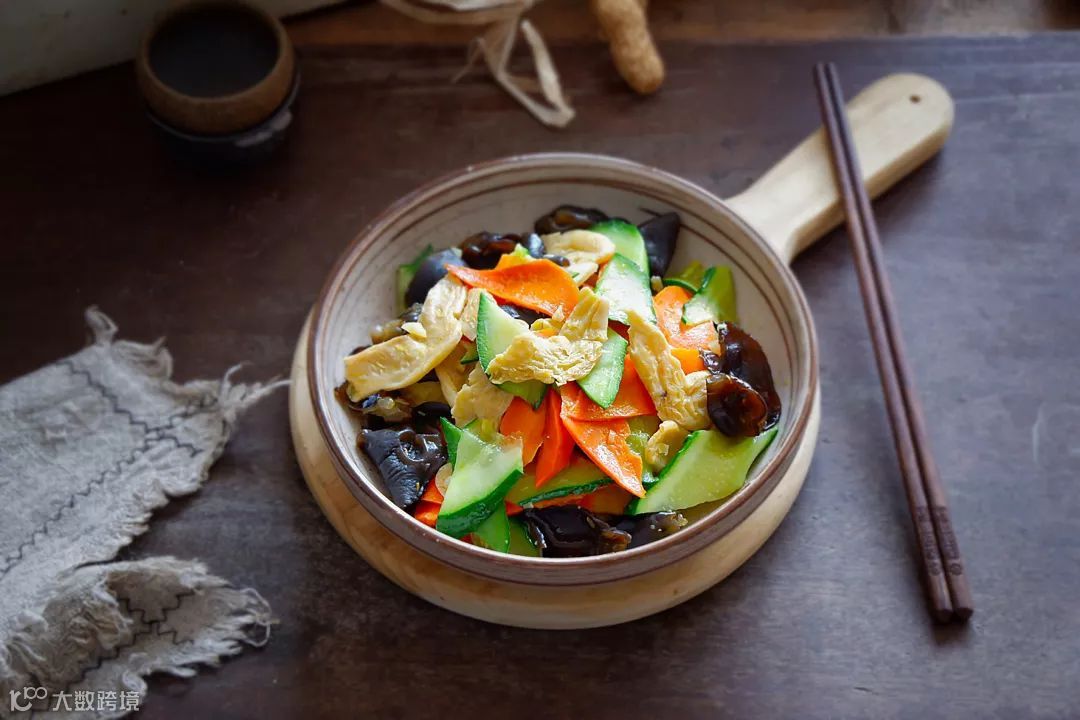 大豆蛋白片50克,黑木耳5朵,胡萝卜半根,黄瓜1根,食盐2茶匙,蔬果调味粉1茶匙,胡椒粉1茶匙