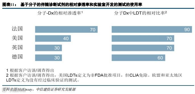伴随诊断的渗透率与监管和支付高度相关,例如法国,政府对分子诊断资助较高,伴随诊断相对渗透率高达70%,而在报销严格的英国、德国,相对渗透率仅30%。