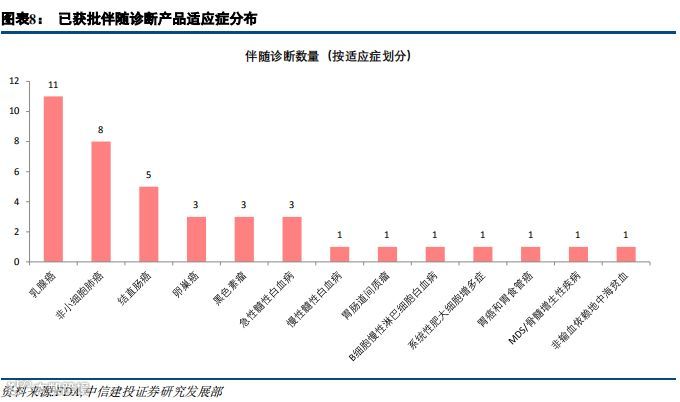 从适应症来看,乳腺癌和非小细胞肺癌是主要适应症,对应伴随诊断数量分别是11个、8个;