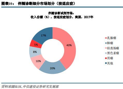 根据KOL Opinions的调查,乳腺癌应用占伴随诊断应用的约40%,是最大的应用场景,其次是肺癌约占20%,结直肠癌约10%,胃癌约5%,黑色素瘤8%。