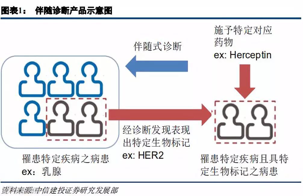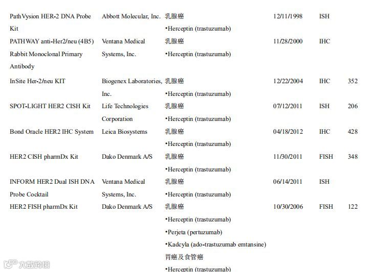 伴随诊断的说明书一般需要说明与之对应的一个或多个治疗药物,以乳腺癌治疗药物赫赛汀(Herceptin)为例,其伴随诊断生物标志物为HER2,20%-30%乳腺癌患者有HER2过表达,可作为乳腺癌治疗预后因子之一。
