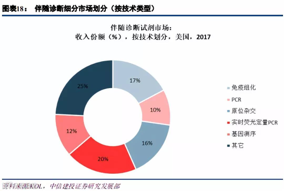 目前已开发了多种伴随诊断试剂盒用于各类癌症生物标志物的检测,该细分市场的主要驱动力是靶向性药物研发的增长,需要相应的伴随诊断试剂盒的开发。