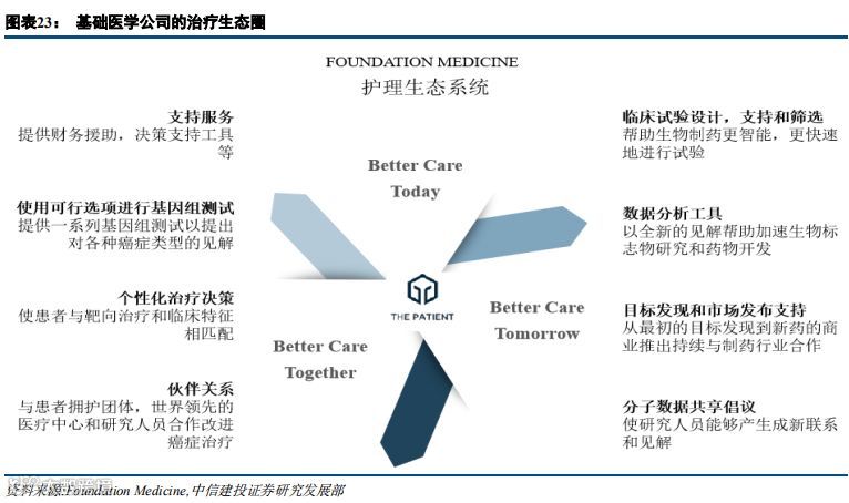 除了对患者提供突变基因检测及生物标志物测定外,Foundation Medicine还与制药公司合作,帮助其进行生物标志物的发现、临床试验的优化及靶向药伴随诊断产品的商业化。