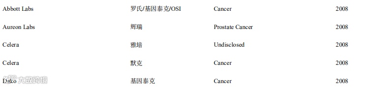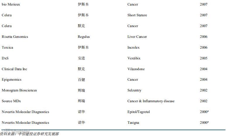Eli Lily于2010年以3亿美元收购Avid Radiopharmaceuticals以开发一个阿尔茨海默病的诊断依据,诺华制药于2011年以4.7亿美元收购Genoptix的临床测试实验室业务。