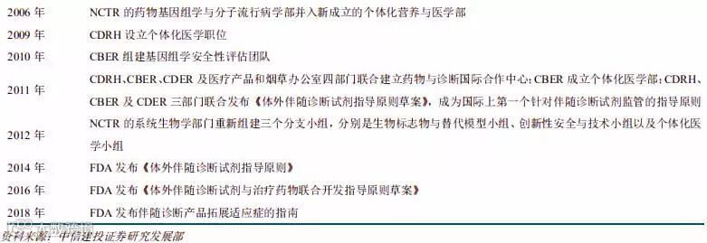 美国引领精准医疗创新,治疗理念亦最先切换至个体化诊疗,审批政策上采取治疗药物与其伴随诊断同步审评,药审和器审合作审批的形式。
