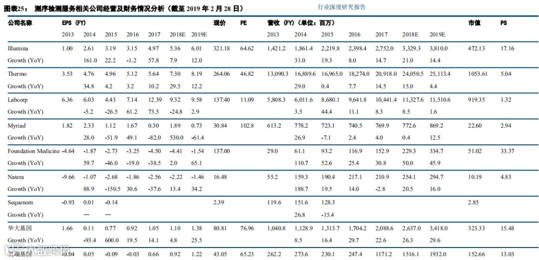 欧美代表性公司有雅培(Abbott Molecular)、罗氏(Roche)、LabCorp、默克(Merck&Co.Inc.)、麦利亚德基因(Myriad Genetics)、NeoGenomics、凯杰(QIAGEN N.V.)、 赛默飞(Thermo Fisher scientific, Inc)。