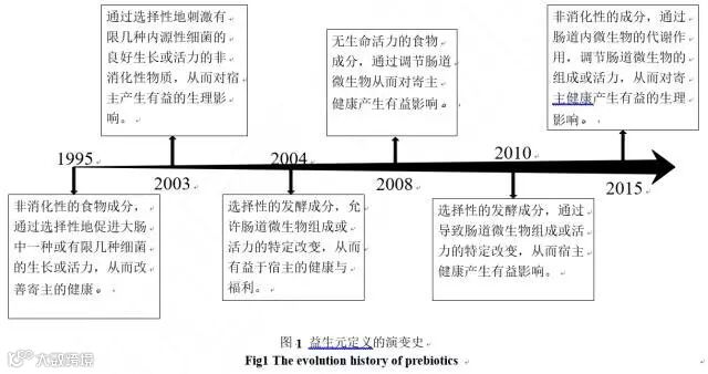 经过 20 余年的研究,益生元的定义和范围不断丰富。图 1 为益生元定义被修改的历程, 新的版本是由 Bindels 等人于 2015 年在《PERSPECTIVES》杂志上发表,益生元终被定义为通过肠道内微生物的代谢作用并可调节肠道微生物的组成或活力、从而对寄主健康产生有益的生理影响的非消化性成分。文章在承认低聚果糖 (fructo-oligosaccharides, FOS) 、反式低聚半乳糖(trans-galactooligosaccharides, tGOS)、菊粉(inulin)以及人乳低聚糖(human milk oligosaccharide, HMOS) 等公认益生元地位的基础上,同时将抗性淀粉(resistant starch,RS)、果胶、阿拉伯木聚糖(arabinoxulan,AOX)、全谷物、膳食纤维以及其他具有调节肠道微生物作用的非碳水化合物列为潜在益生元。此次修订恰逢益生元定义产生 20 周年,文章进一步扩大了益生元的范畴;文中认为,以往有关益生元的研究大都集中于选择性促进作用、生理影响及其与肠道微生物组成或代谢的关系,而有关建立肠道菌群因果作用的研究仍然有限,因此,Bindels 等人希望今后将益生元的研究重点从对肠道菌群组成影响的定性研究转移至健康影响得以实现的机制上去。这对于帮助理解膳食-微生物-寄主之间相互作用关系具有重要的指导意义。