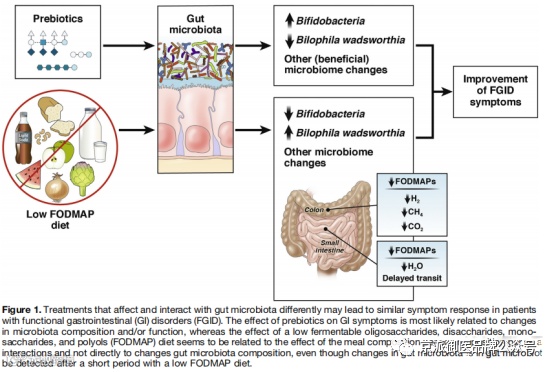 Gastroenterology上曾发表的一篇综述[4],肠道菌群在功能性肠病(FGID)和IBS的症状产生过程中起重要作用,而低FODMAP(可发酵的碳水化合物)饮食和益生元(低聚半乳糖)可分别通过不同机制改善功能性胃肠病(FGID)症状,但二者结合可能效果更好。