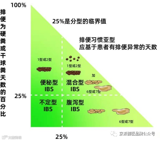 根据罗马Ⅳ标准,结合布里斯托分类法,可以将IBS分为便秘型IBS、腹泻型IBS、混合型IBS、不定型IBS四种亚型。