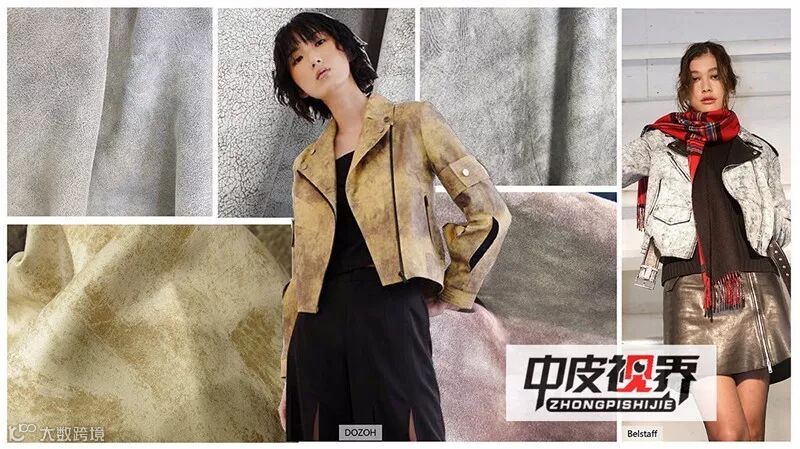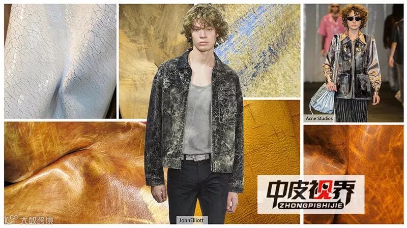 磨损和做旧效果打造出户外感十足的印花和图案。裂纹、摩擦和做旧工艺可以营造出复古感。皮革、麂皮和漆皮材质经过水洗、喷砂或烧焦后更加新潮时尚。