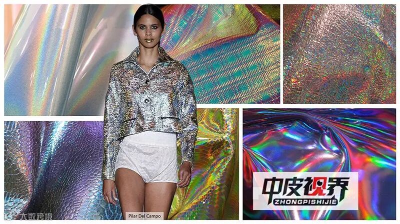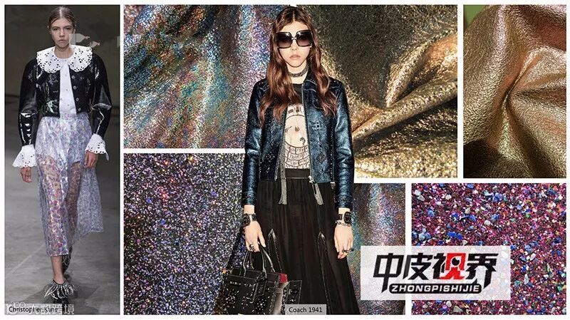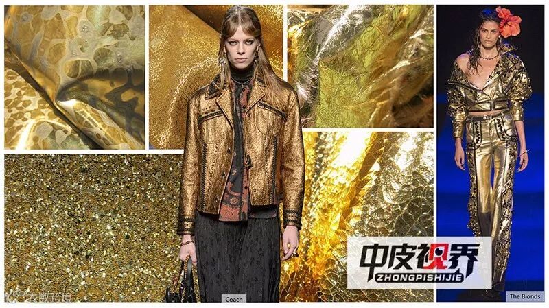 粗糙的闪光金葱效果在19春夏兴起,打造银河般的外观。玫瑰金、红铜、金和银色具有商业吸引力,而醒目的粉色、蓝色和紫色提升高端鞋履和配饰。彩色效果、平面碎石纹理翻新大热的金葱表面。