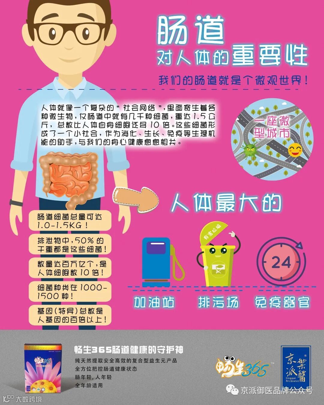 肠道不仅是人体的“营养供应中心”,承包了人体93%的营养物质消化和吸收的重大使命和任务;还掌管着人体70%的免疫细胞,是人体抵御感染和过敏物质的第一道防线;另外,肠道还是人体的大型“排污厂”,80%毒素都靠肠道排泄。肠道在人体中就像“劳模”一样的存在,在人体健康运转中居功至伟。