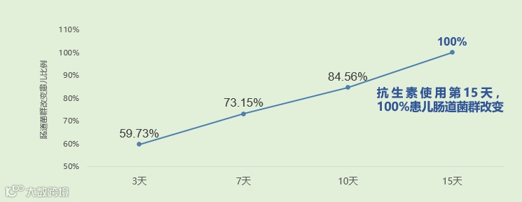 主要原因是由于部分医生和家长对于抗生素相关知识严重匮乏,对抗生素的危害认识不足,抗生素滥用所导致,同时抗生素在动物食品肉、蛋、奶中的大量残留也是儿童抗生素高暴露的原因之一。研究显示,当小儿应用抗生素后,随着时间的增加,发生肠道菌群改变比例会逐步增加,最后64.43%的患儿出现肠道菌群失调。抗生素成为当今儿童肠道菌群失调的重要推手之一。