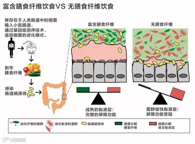 美国密西根大学的实验显示,在膳食纤维充足的情况下,肠道菌群能更好地维持健康的稳态。健康的黏液层能够阻止病原入侵,提高机体的免疫力。而膳食纤维缺乏将使肠道菌群结构发生变化,黏液层被破坏,增加病原入侵的风险。