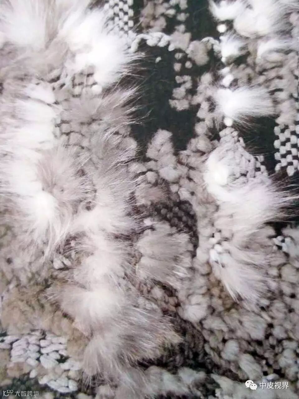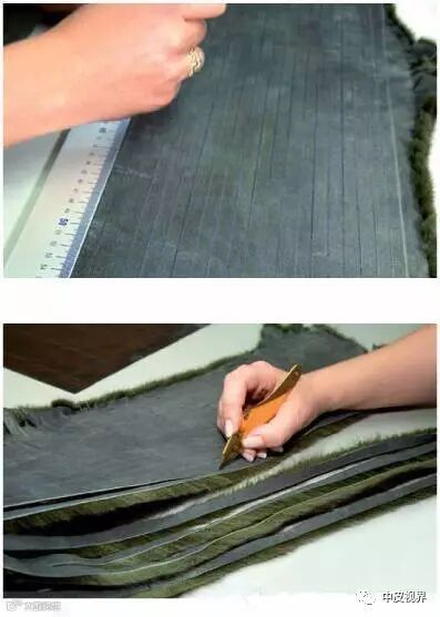 目前皮毛编织全部采用的是人工编织,没有机织。先根据毛绒的密度将皮毛裁切成0.3~0.5cm的毛条,然后根据规格与色彩相配的网布,将皮毛顺毛方向按照一定的图形走向进行编织。