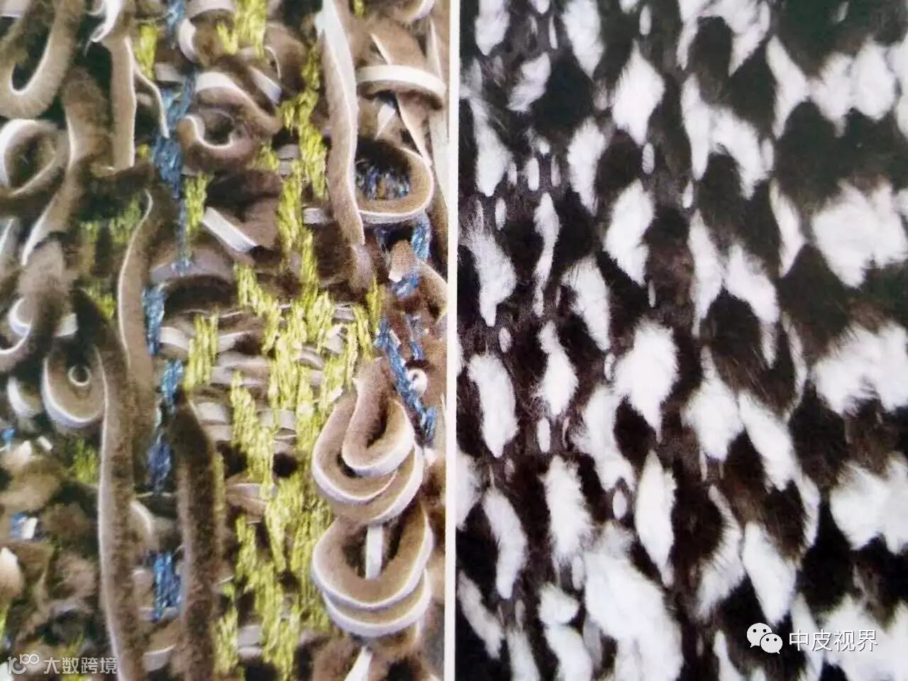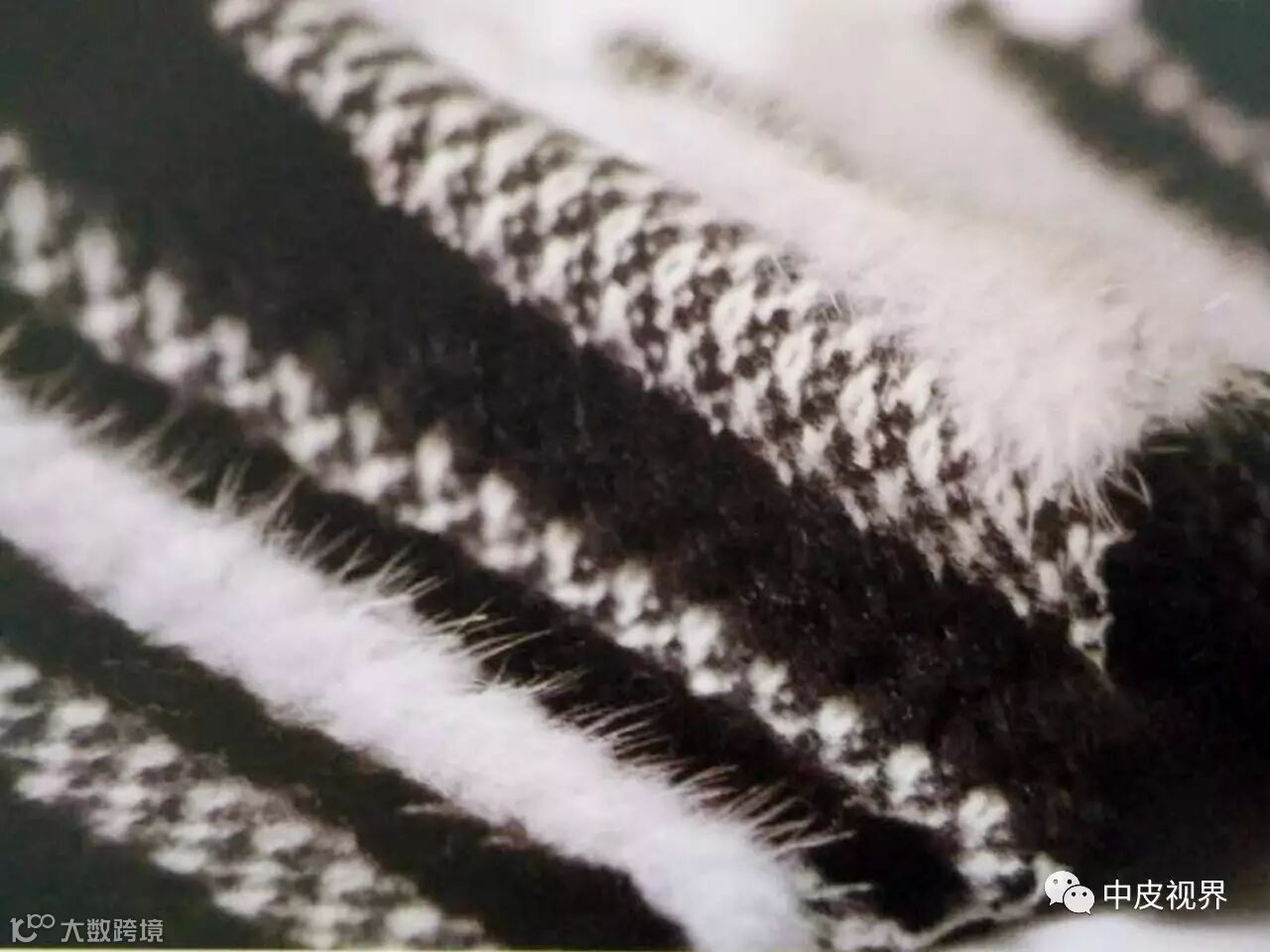 编织工艺的开皮条有两种方式,纵向开皮和横向开皮。纵向开皮方式较常用,需注意头毛和尾毛密度不同,如果毛份对比太过悬殊既要进行修剪;横向开皮时毛向是向下的,底绒易显露,但编后的图案层次感强;脊骨毛色对编织图案会有影响,编织工艺打乱了原有的毛皮纹理,重新进行混合重组,利用好这一特点,可以获得全新的美感。