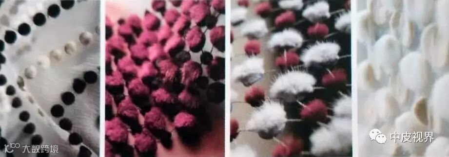 将毛条切割成圆形、方形、三角形等等几何形状,车缝于不同质地的材料上。