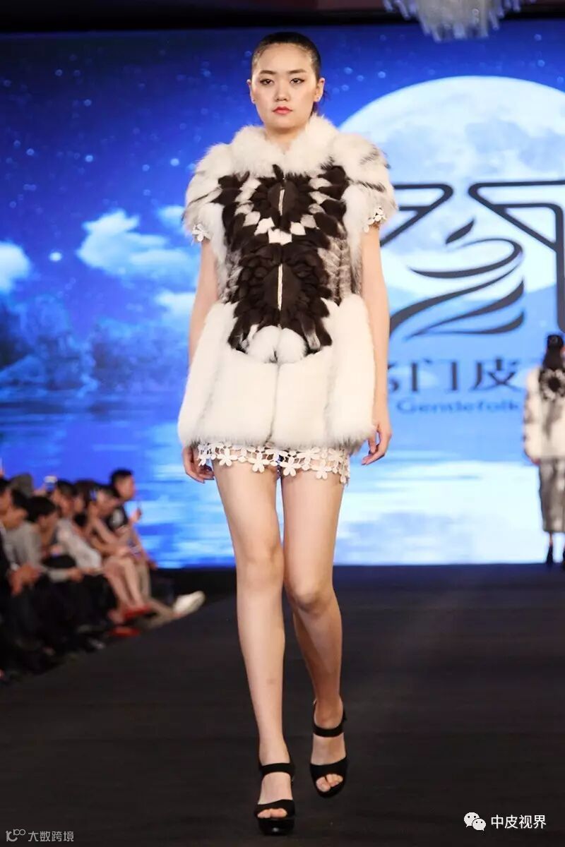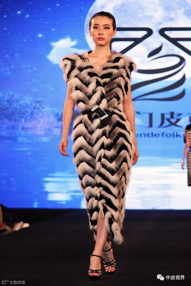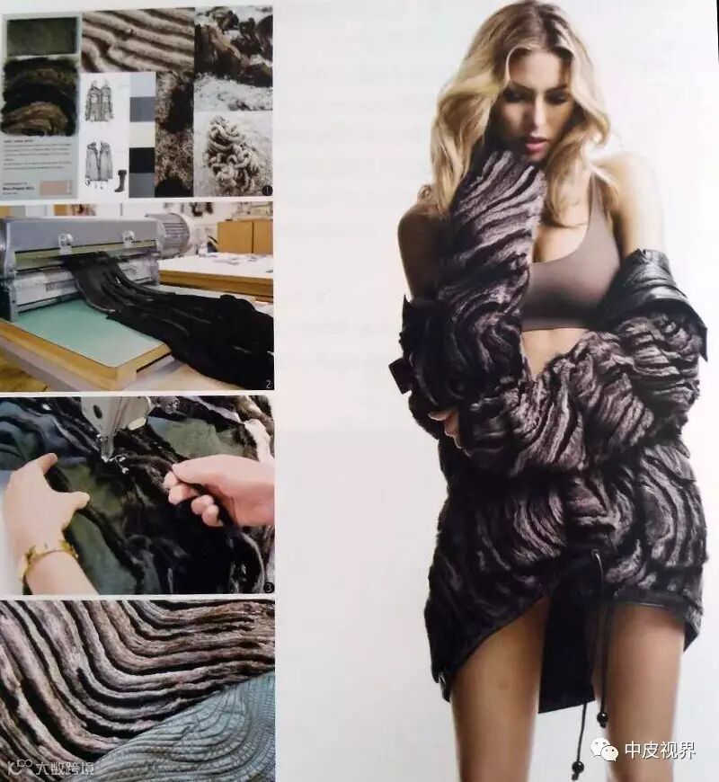 首先要考虑长毛和短毛皮板的裁皮尺寸。一般来说,长毛皮板相对要窄,短毛皮板可略宽。条纹之间的行距变化以相互略有重叠、遮盖住底布为原则,突显毛皮本身绒毛与针毛的美感。当底布的肌理纹路是材质设计表现的一部分时,要事先计算好毛皮遮挡部分与底纹显露部分的合理距离表现。