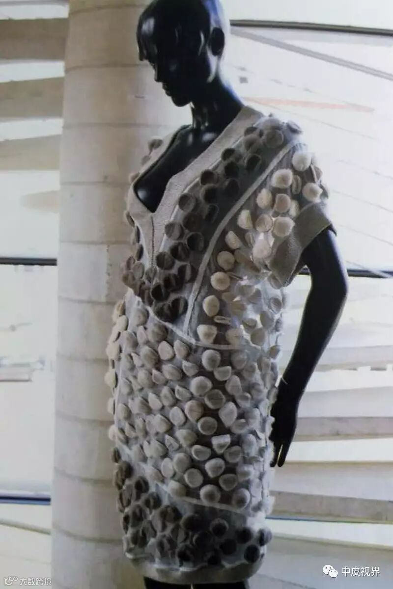 点状车缝工艺即将毛皮原料切割成点状的小块毛皮,再将其排列组合并缝缀于面料上。无论毛针长短,其图案的设置和行距变化仍以毛针完全遮住底布并能够相互略有重叠为准。有时,在夏装或晚礼服的设计中,点状毛皮可能只作为装饰而局部出现,或完全与布料融合而成为其中的一部分,此时,毛皮的使用便没有了界线,可以完全根据设计的需要随意添加。