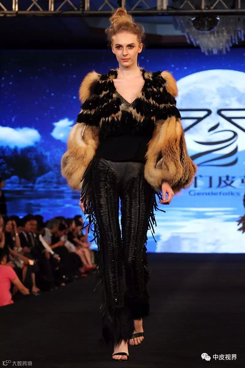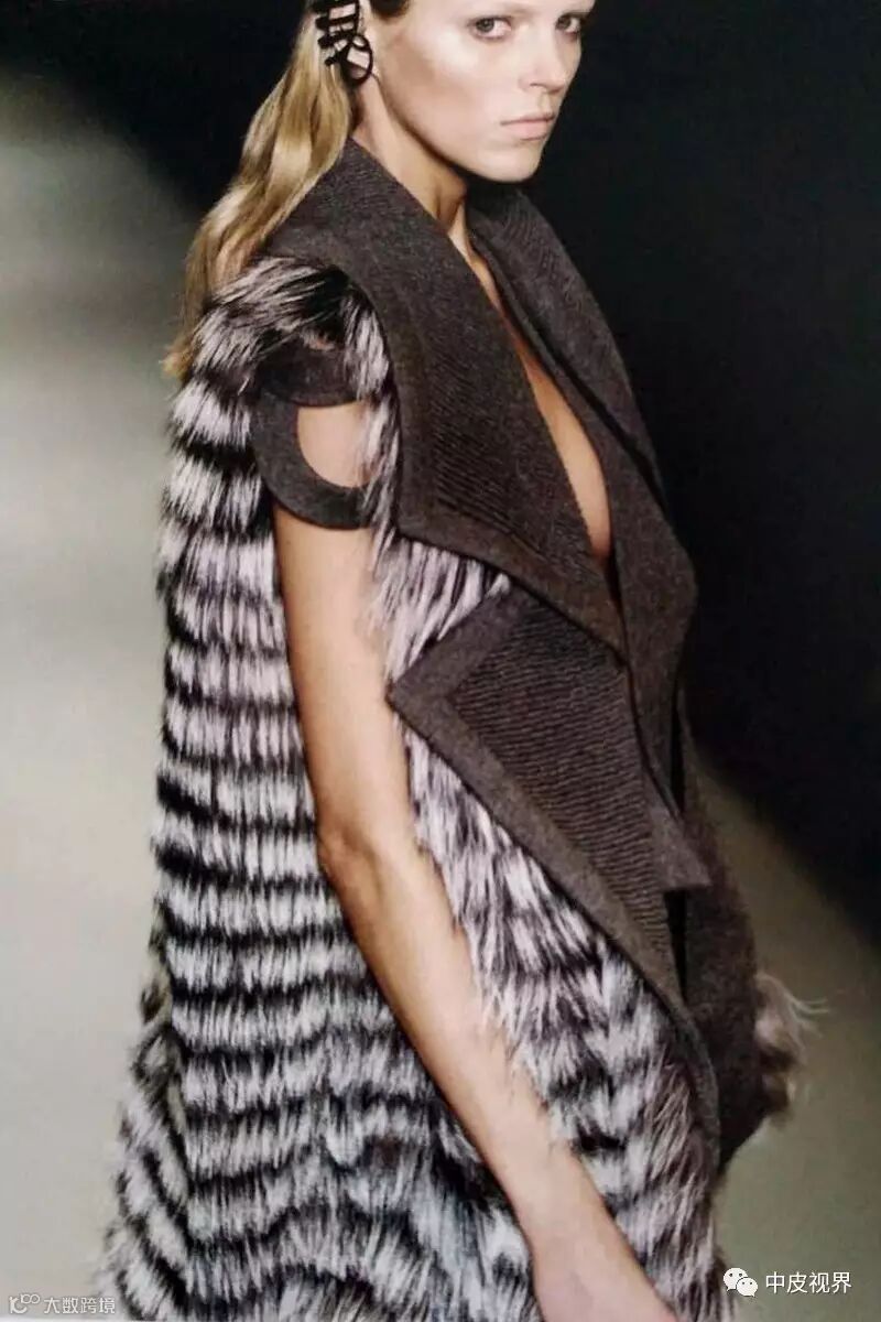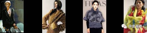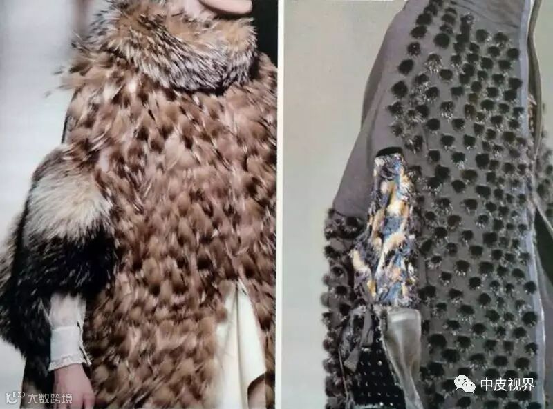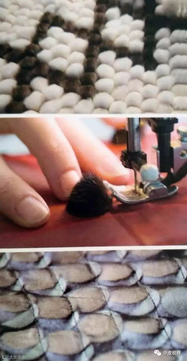 一般是将毛皮切成条状,一般是将毛皮切割成12.5px左右宽的毛条,毛高在20px~30px的基础上。然后根据设计的需要以不同的形状规律排列组合并缝合于面料上。常见的形状有横向和斜向条状排列,圆形、三角形、正方形等“化状”排列。车缝类的毛皮服装因降低了毛皮的用量而格外轻盈,蕾丝、雪纺类的底布使用又使车缝类服装变得更加轻薄甚至透明。