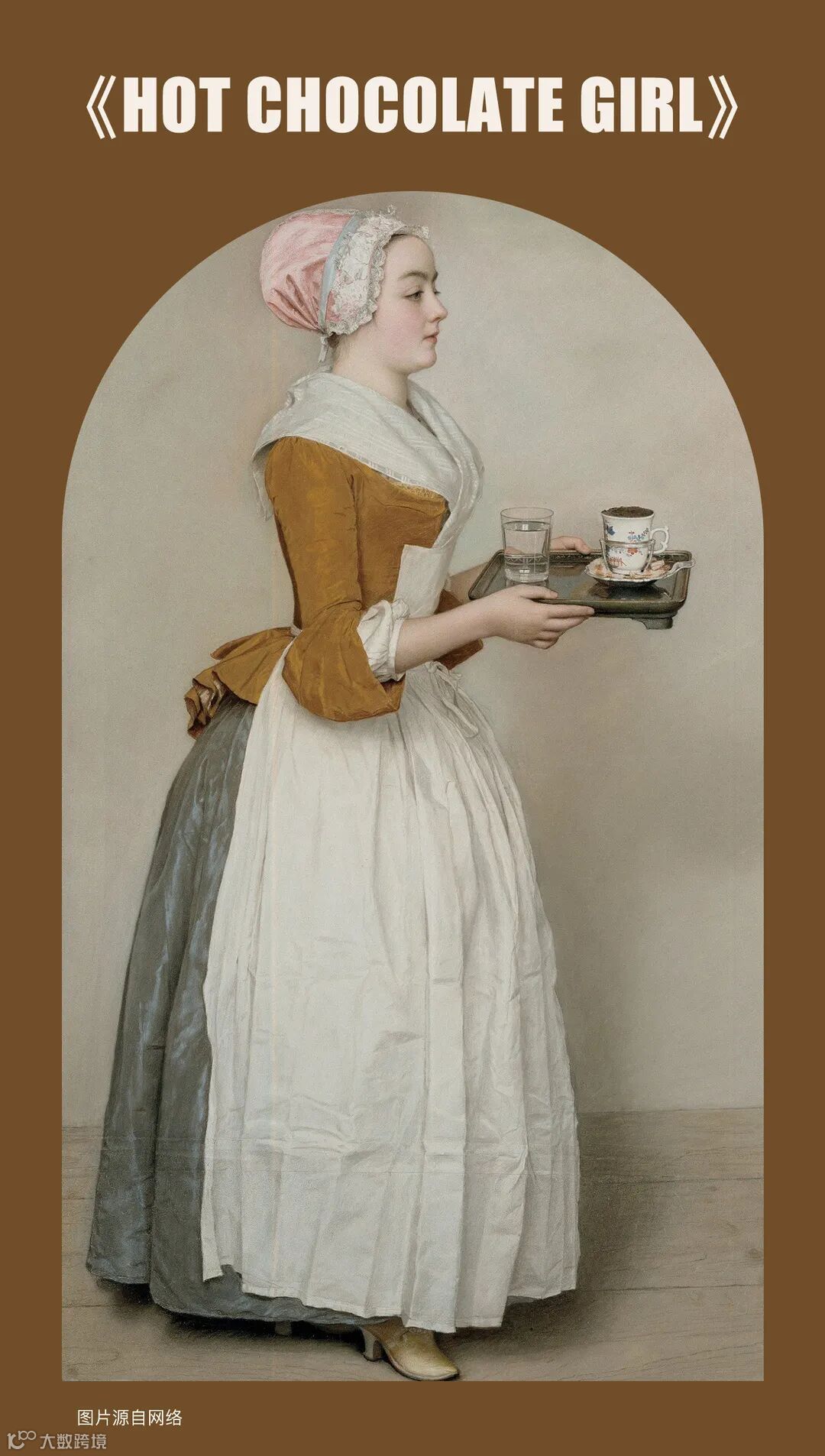 瑞士画家利奥塔(Jean-Etienne Liotard)的著作《热巧克力姑娘》被誉为“史上最美色粉画”。作为维也纳宫廷画师,利奥塔用柔和的色粉笔描绘了一幅简洁而精美绝伦的洛可可肖像。传说中这幅画作还有一个有趣的故事,安娜·巴尔道夫在热巧饮品店工作,冯·迪特里希施泰因伯爵在那里与她相遇并一见钟情。此后,伯爵每天都去那家店里喝热巧,在二人新婚之时,请了利奥塔为新娘以伯爵最熟悉也最热爱的装扮画了这幅肖像,并命名为《热巧克力姑娘》。