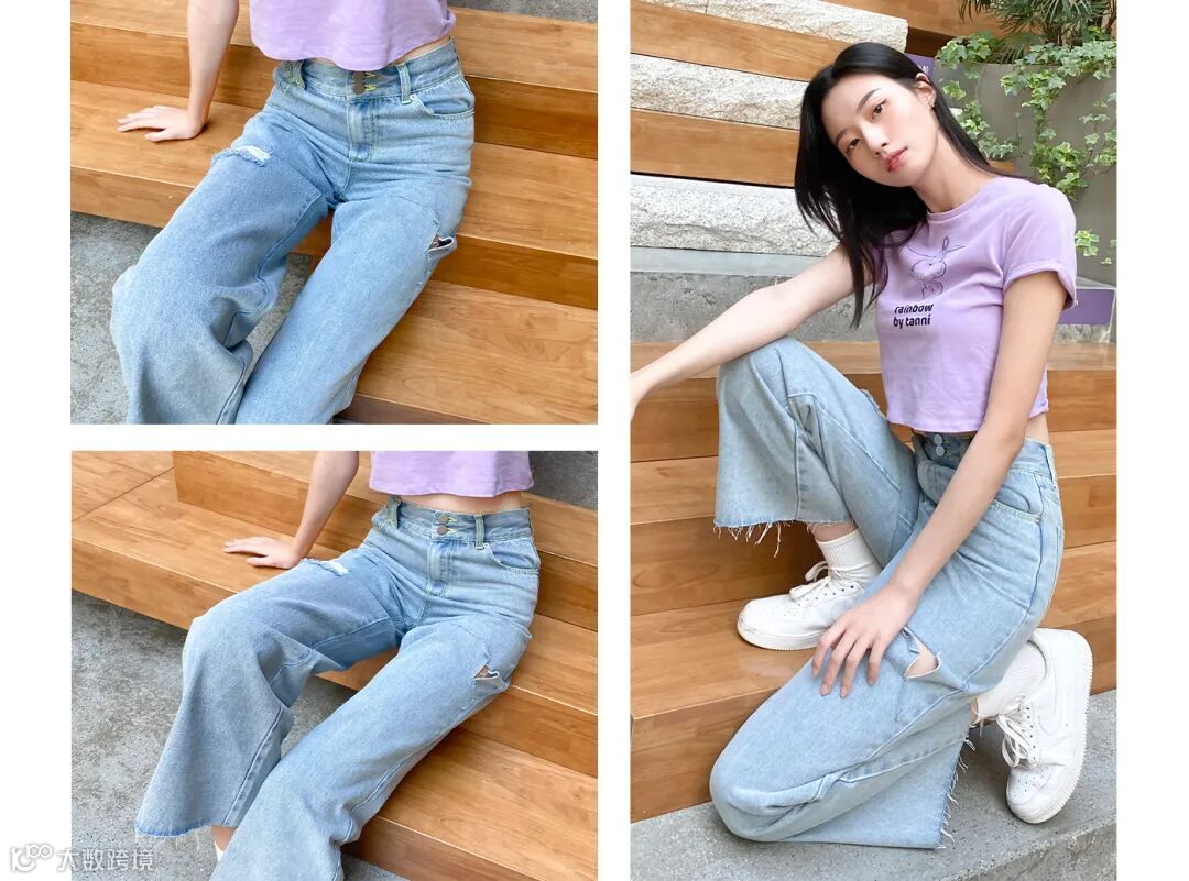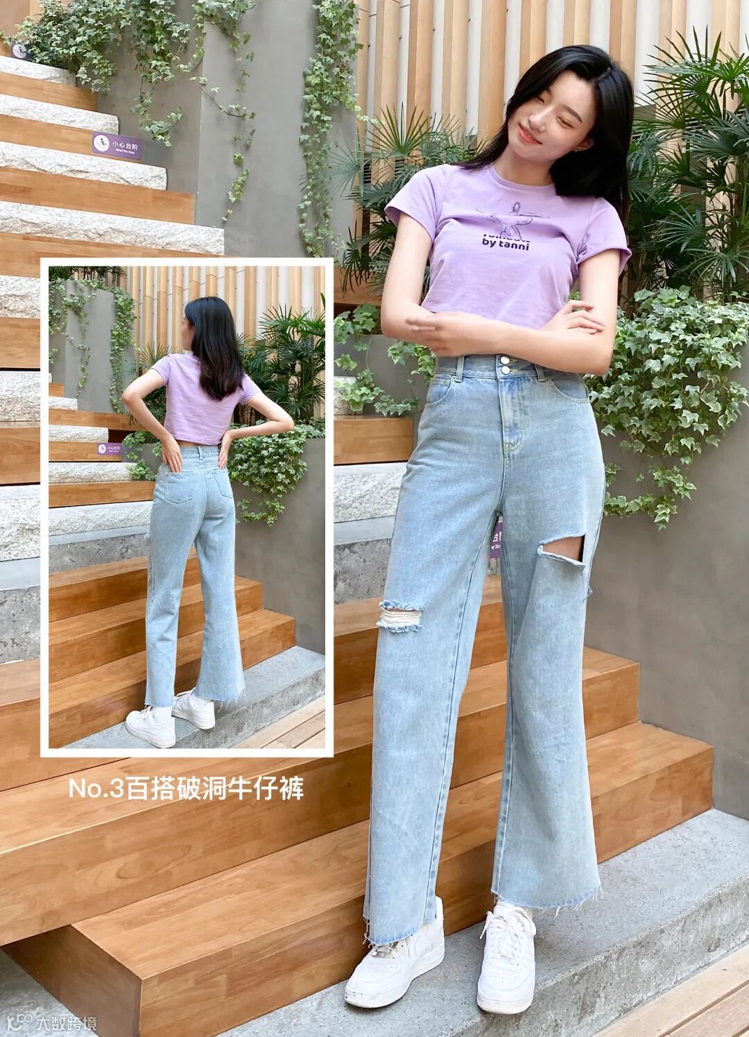 浅蓝色高腰阔腿破洞牛仔裤,无论是搭配露肚小件短袖,或是温暖的针织上衣,还是舒服帅气的百变卫衣,各种风格都被拿捏的死死的。106cm的裤长使你的腿型更显纤长,破洞的设计增加透气感和时尚感,带毛边的裤脚和运动鞋融为一体,一定是属于酷 girl 街拍的必备单品。