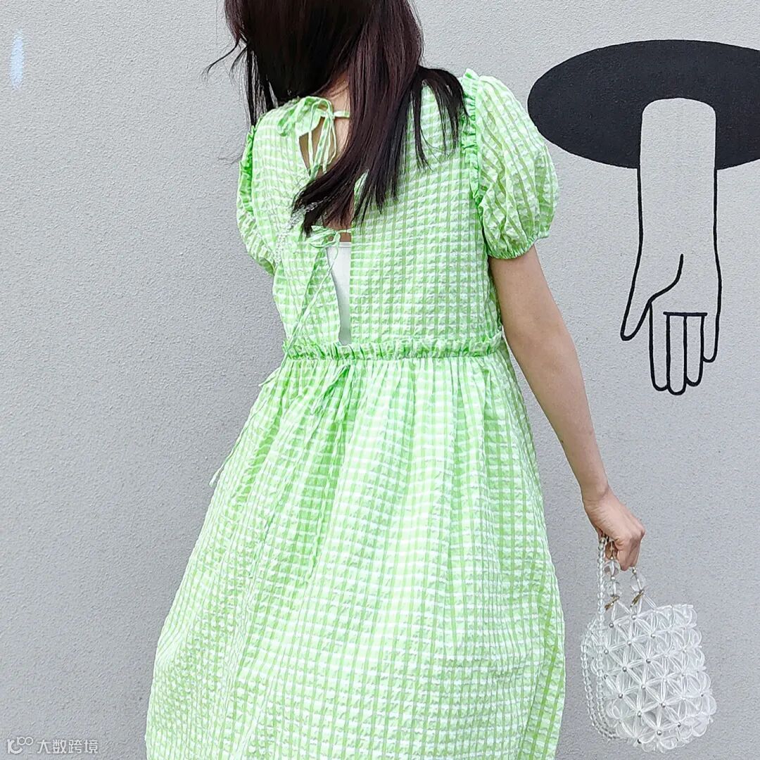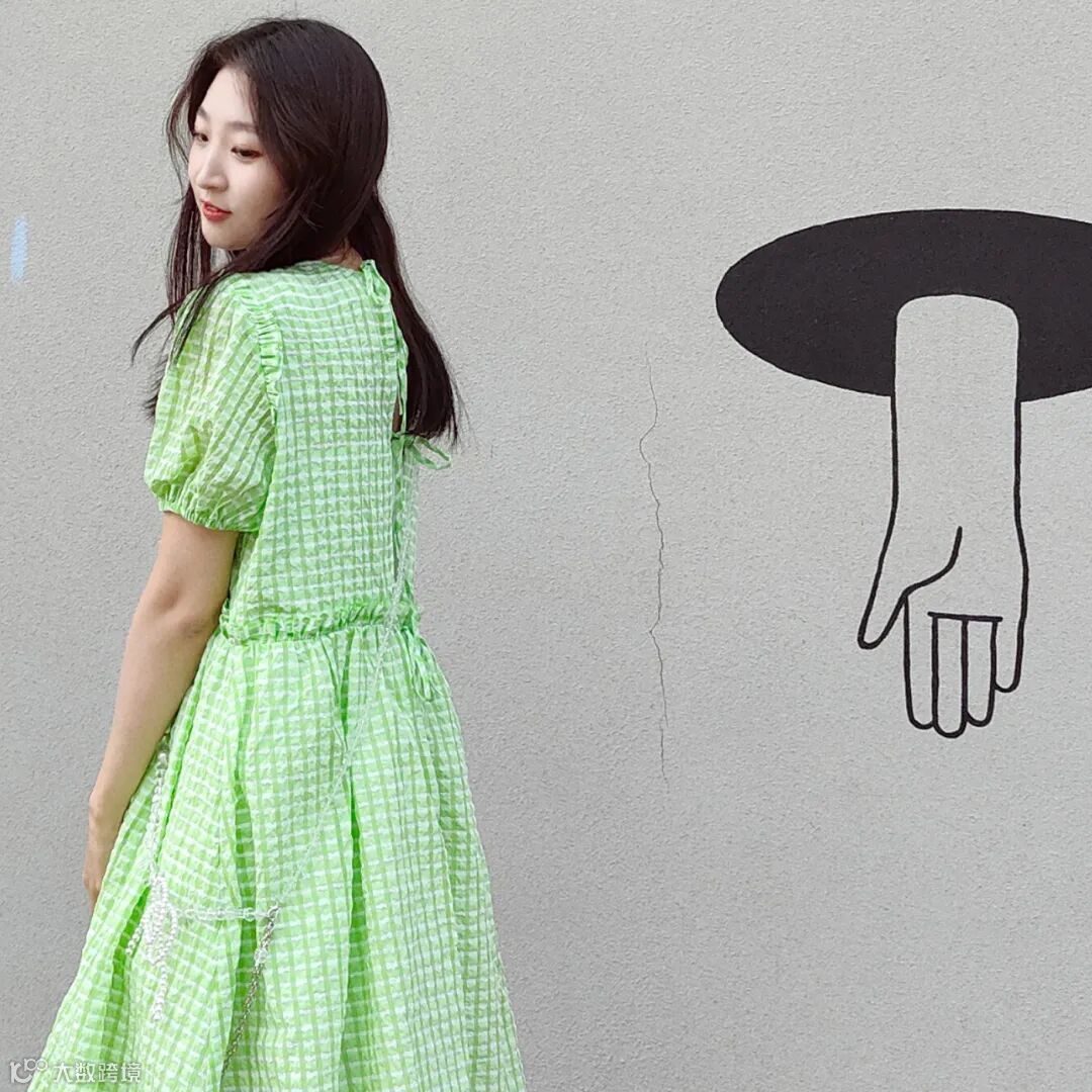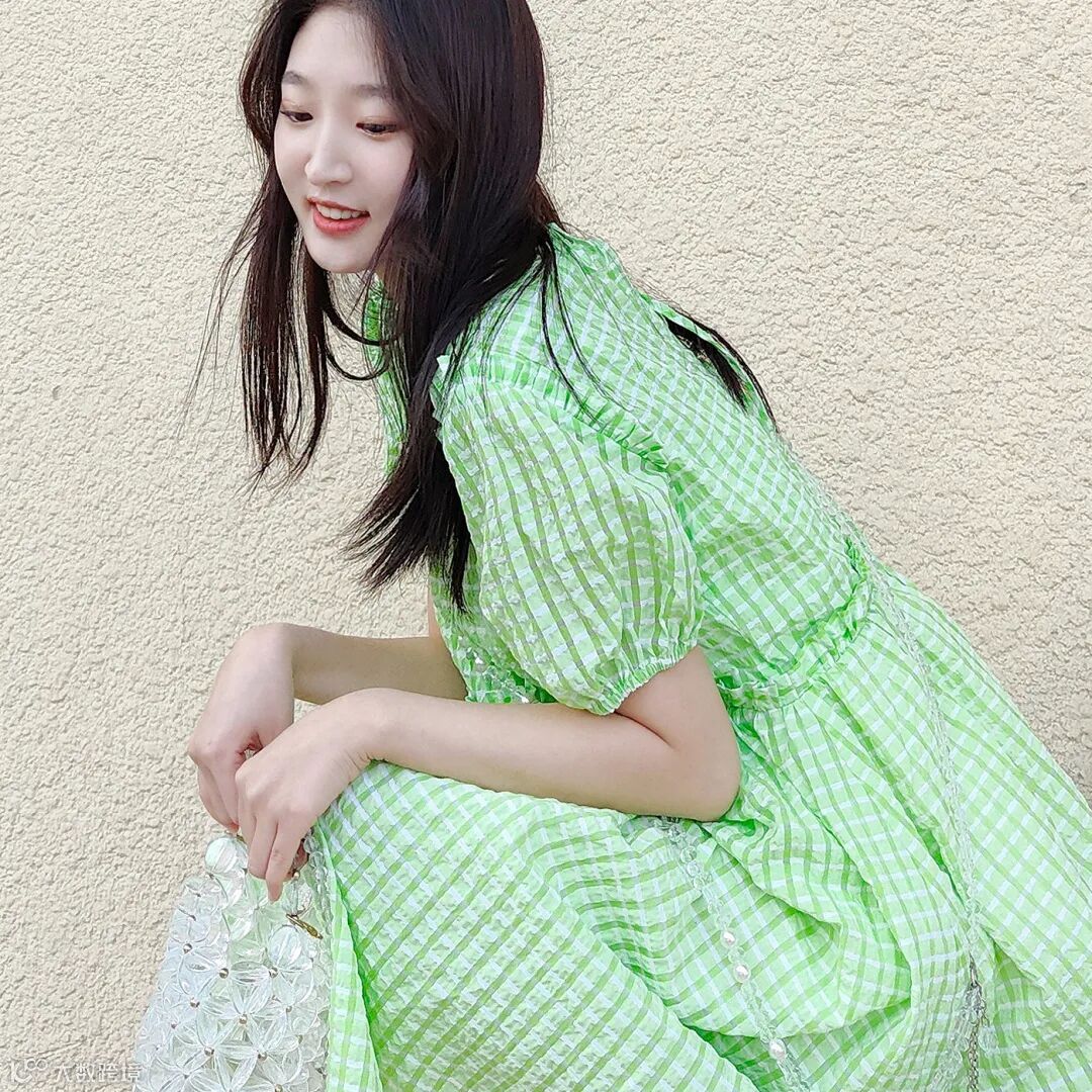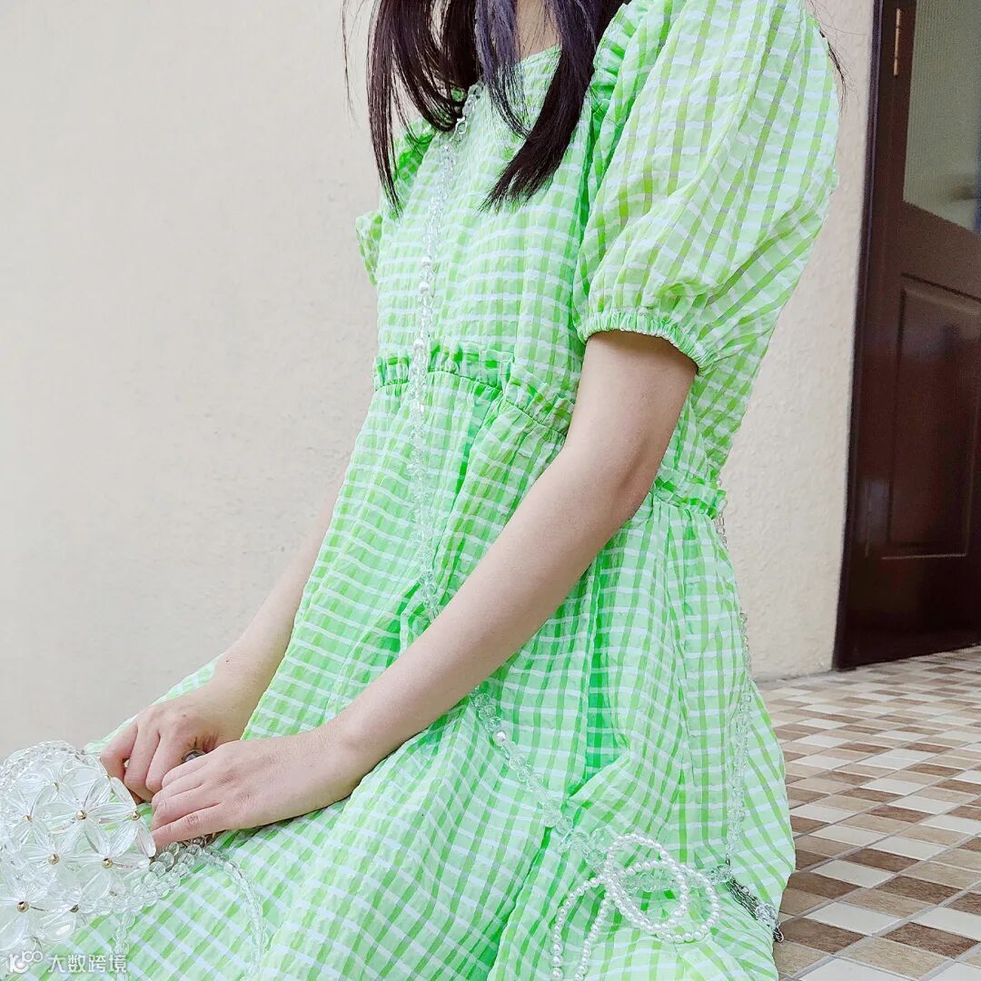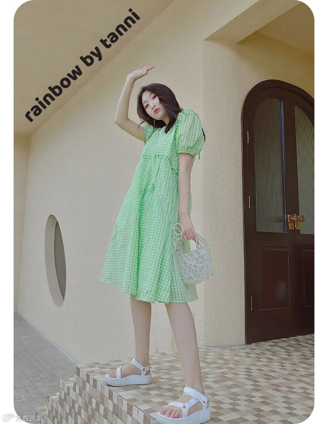 rainbow by tanni:清爽的绿色搭配清新小格子泡泡袖尽显可爱俏皮