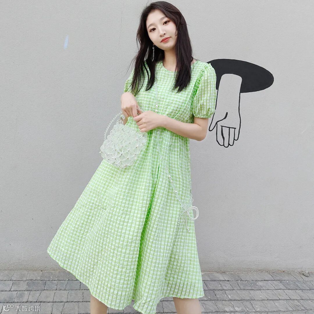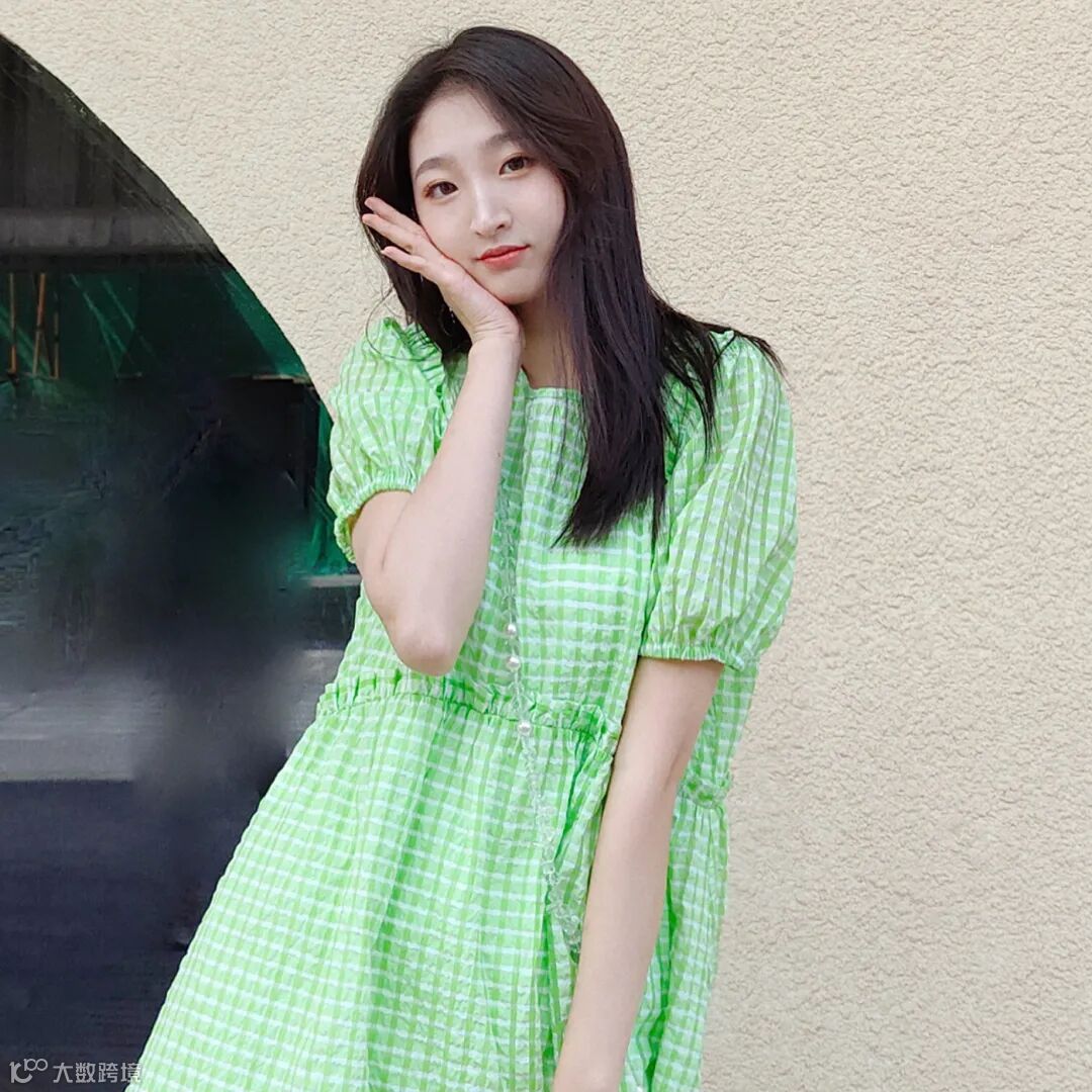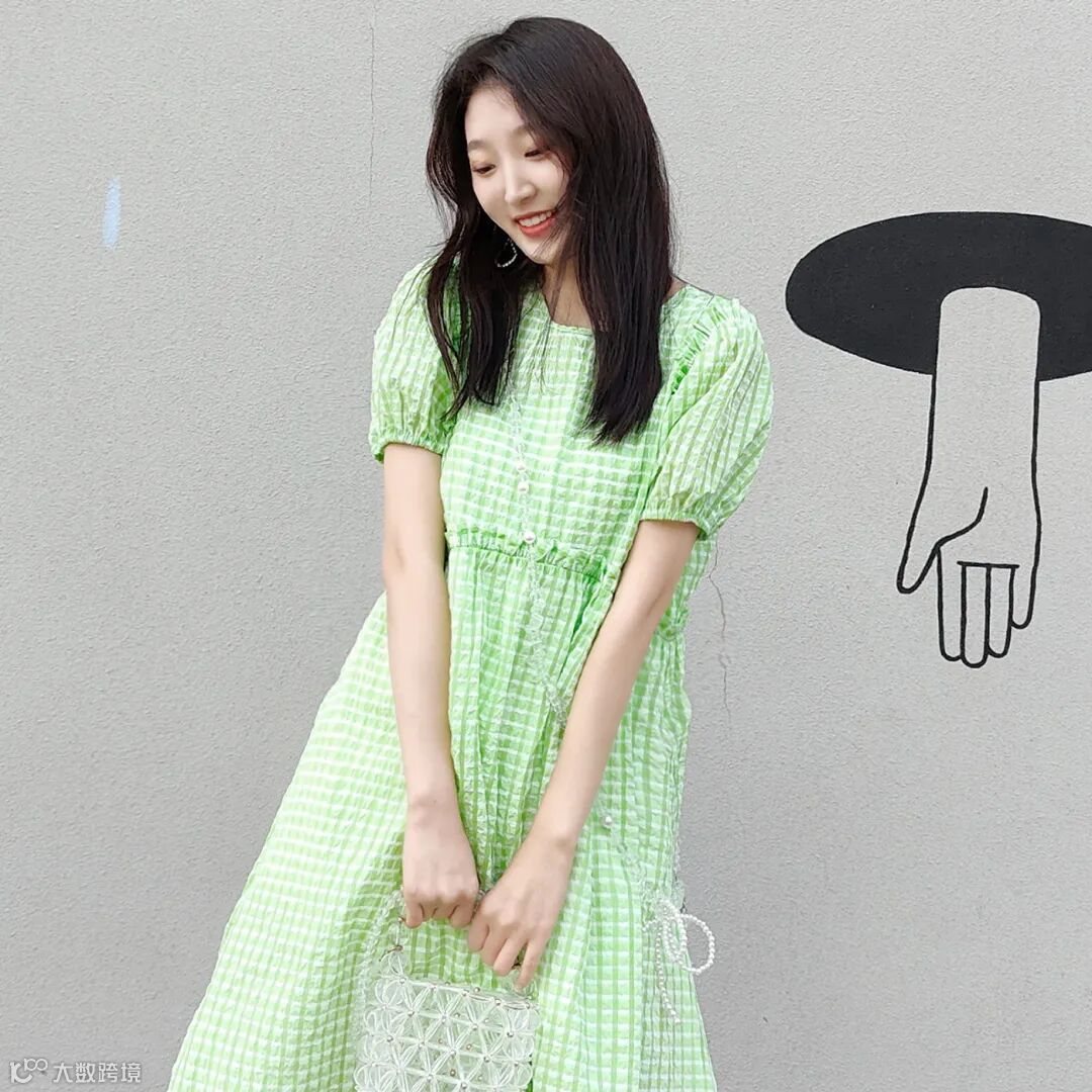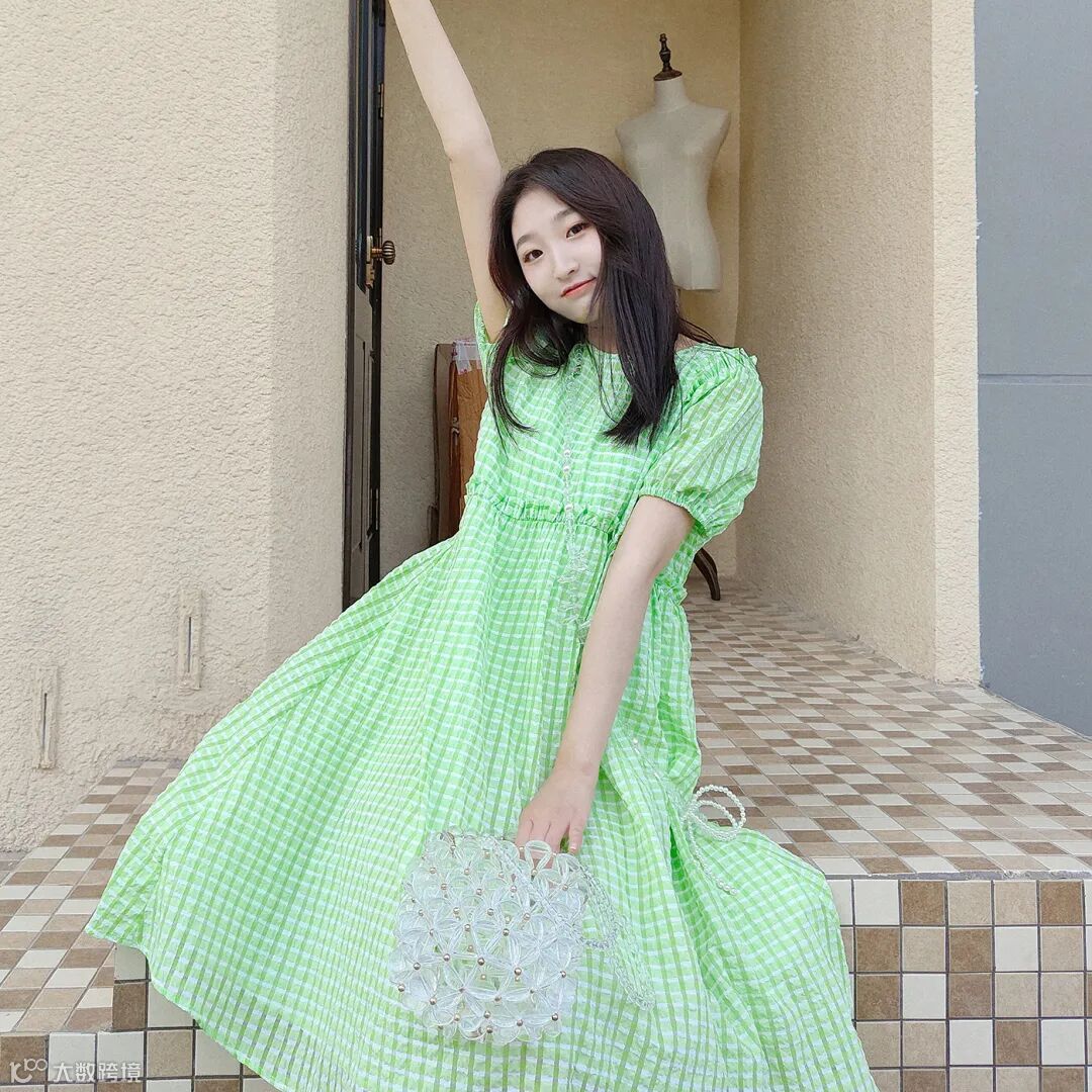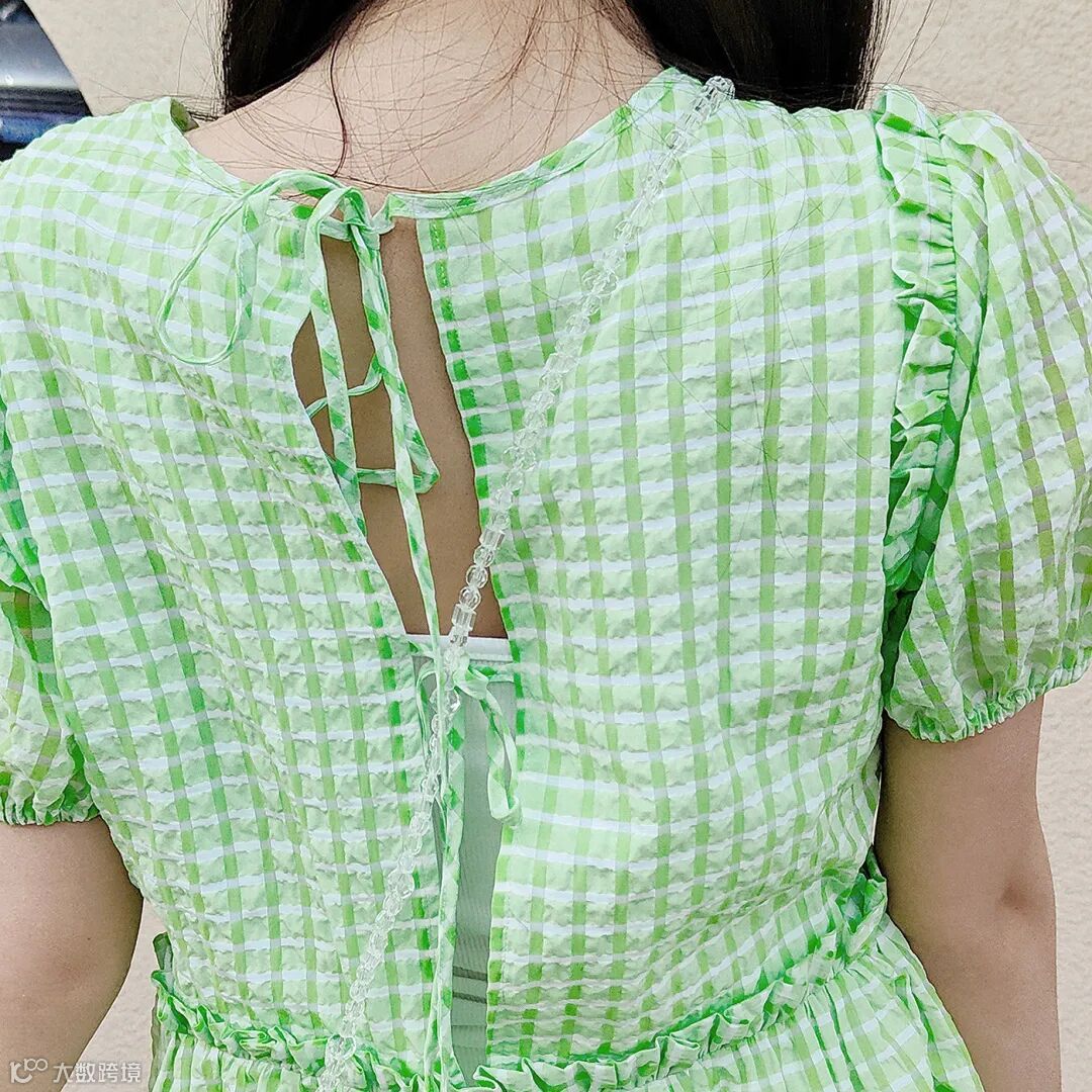 rainbow by tanni:清爽的绿色搭配清新小格子泡泡袖尽显可爱俏皮