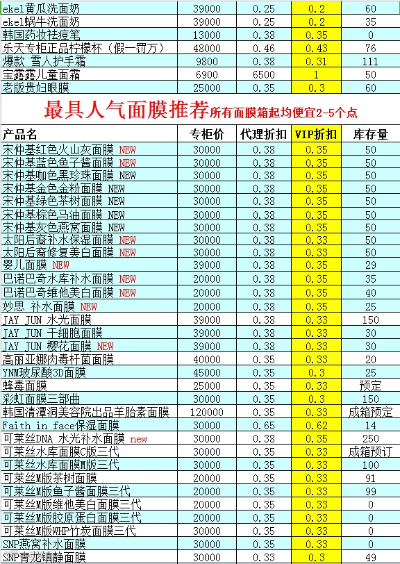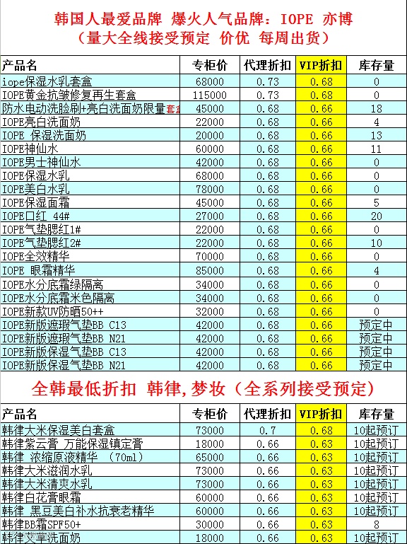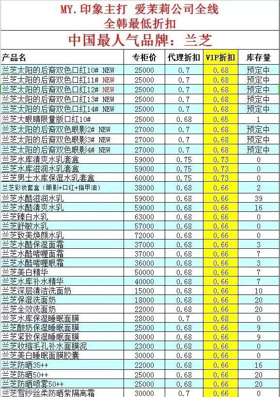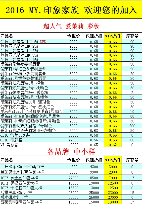 1、关注微信订阅号——myyinxiang520(my印象韩妆studio),回复数字一查看我们最新的现货折扣表。(刚关注微信不显示现货折扣表的亲,请查看历史消息,搜索便可。)