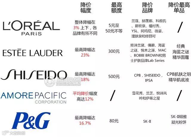 【雅诗兰黛集团】此次降价品牌囊括了雅诗兰黛公司在中国市场的所有护肤彩妆品牌,包括雅诗兰黛、倩碧、海蓝之谜、悦木之源、MAC、BOBBI BROWN和男士护肤品牌Lab Series。雅诗兰黛设计了复杂的降价体系,降幅在11-23%之间,降价最高的要数经典的海蓝之面霜,价格将下调300元。