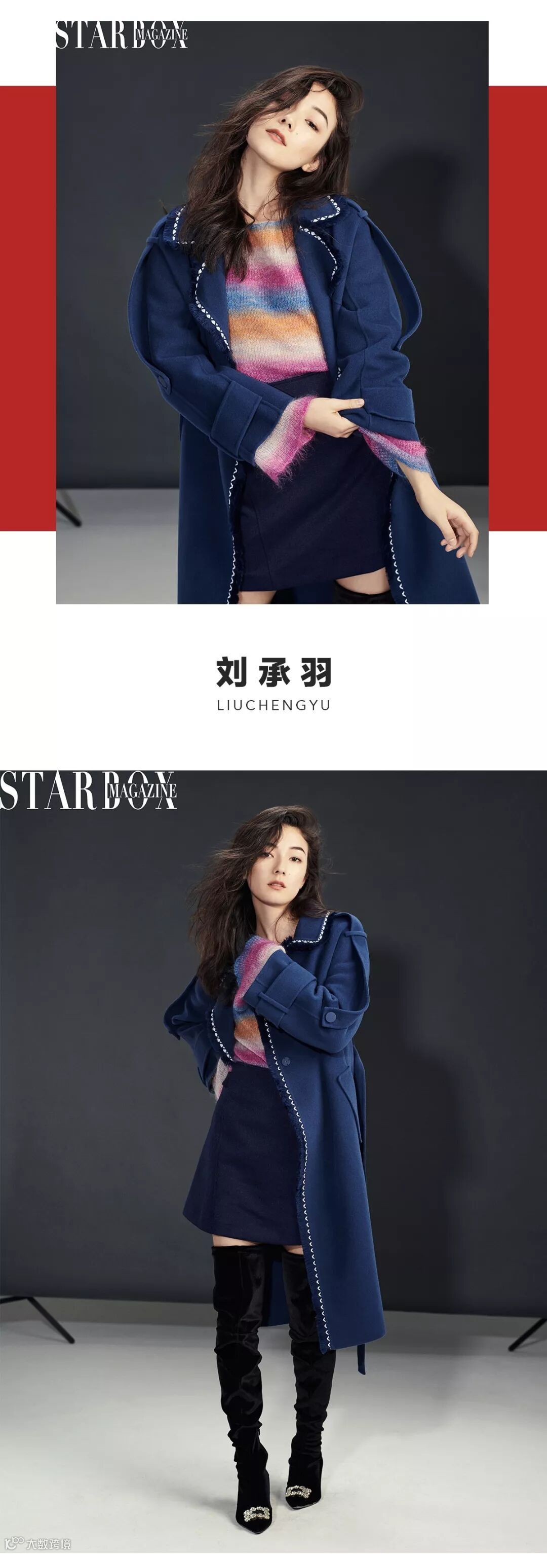 少女率真自信的气质可以由一款深蓝色中长大衣得以演绎,刘承羽以彩虹条纹针织上衣与宝石蓝双面呢大衣结合。撞色刺绣包边的设计难掩经典的时尚魅力,独到的吸引力瞬间爆发,让人过目不忘。